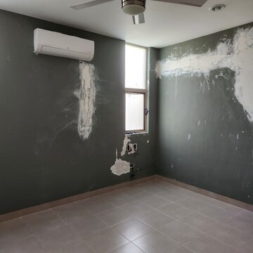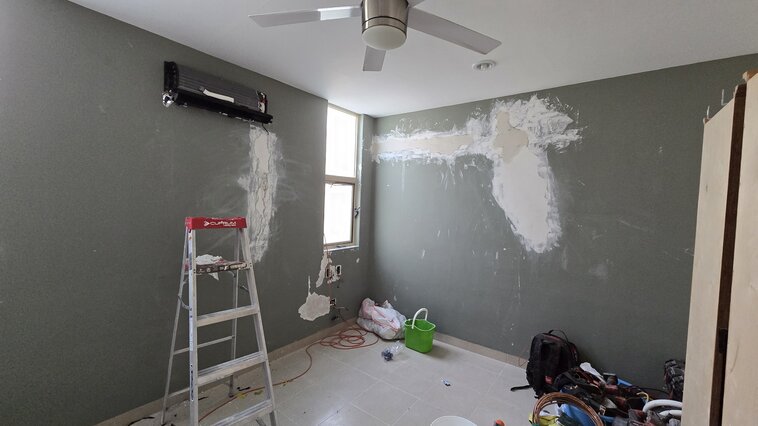 David and his crew continued working, and by the end of the day the AC was mounted on the new wall (but not connected yet) and the holes they had made in the walls were all filled in. They had also sanded down some additional areas on the walls where the paint had previously bubbled up from old water damage as they would also be repainting the entire room once the AC installation was done.
