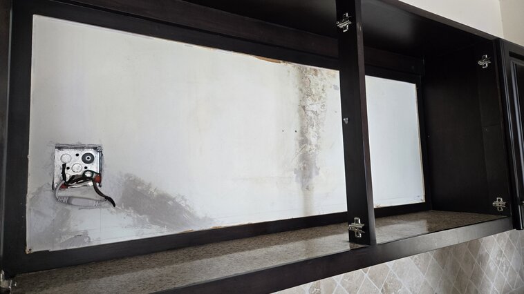 Finally, the day came to work on the cabinets. When Chay removed the back of the upper cabinet, we could clearly see we were right, that there was mold growing there.