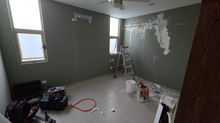 The guys arrived again to fix the water damage on our bathroom ceiling. They also patched up all the cracks they found and, as well, repainted the ceiling.