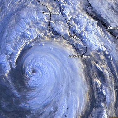 Satellite image of Hurricane Hilary (Cat 4) passing just west of Cabo San Lucas early on August 19.