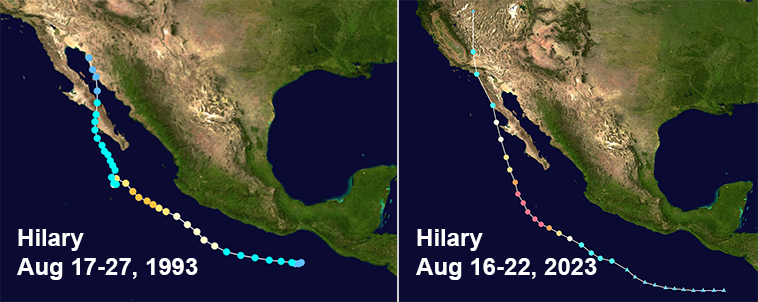 And here’s an interesting tidbit of trivia – storm names repeat every 6 years, and 30 years ago in 1993 a previous Hurricane Hilary travelled nearly the same path as our 2023 Hurricane Hilary did.