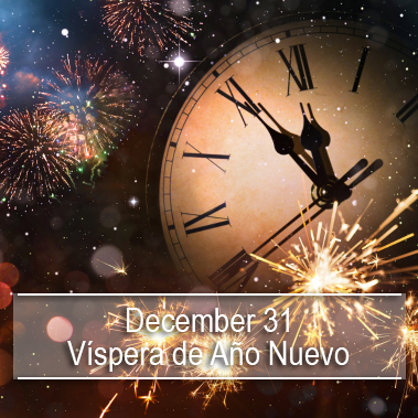 Víspera de Año Nuevo (New Year’s Eve) is enthusiastically celebrated with fiestas and street parties, along with fireworks (and more recently – drone shows) at midnight. After counting down to midnight, it is tradition to eat 12 grapes, one for each ding of the bell which signifies the 12 months of the year.
