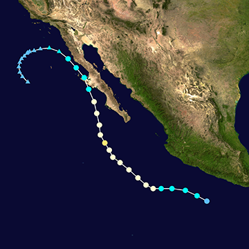 On August 29 a weather formation intensified south of Acapulco, and by September 1, it had become a tropical depression moving north. September 2, it had strengthened into a tropical storm and named Javier. Later that day, the storm crossed over cooler waters and began to weaken and by September 4, Javier became a post-tropical cyclone and moved out to sea.