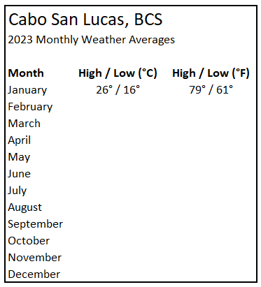 Our temperatures here in Cabo were much cooler in January than they had been during the last part of 2022. Even though our average temperatures were not too bad, we did have a few very chilly days with a high of only 21C (69F) and a low of 8C (46F) where we really needed to dig out our long pants and hoodies to wear around the house, not to mention extra blankets on the bed at night.