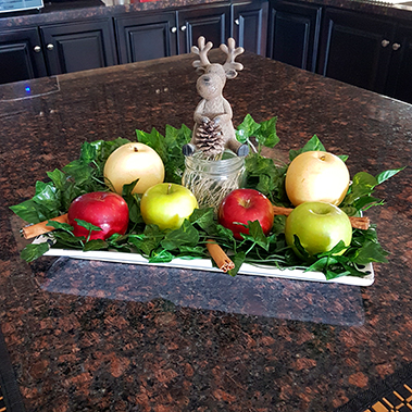 I assembled a centerpiece, which included Apples, Asian pears, and our little Canadian moose with his Antlers.