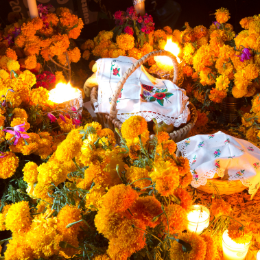 These colourful shrines are decorated with bright yellow marigold flowers, photos of the departed, and the favourite foods and drinks of the one being honoured. The offerings are believed to encourage visits from the departed souls.